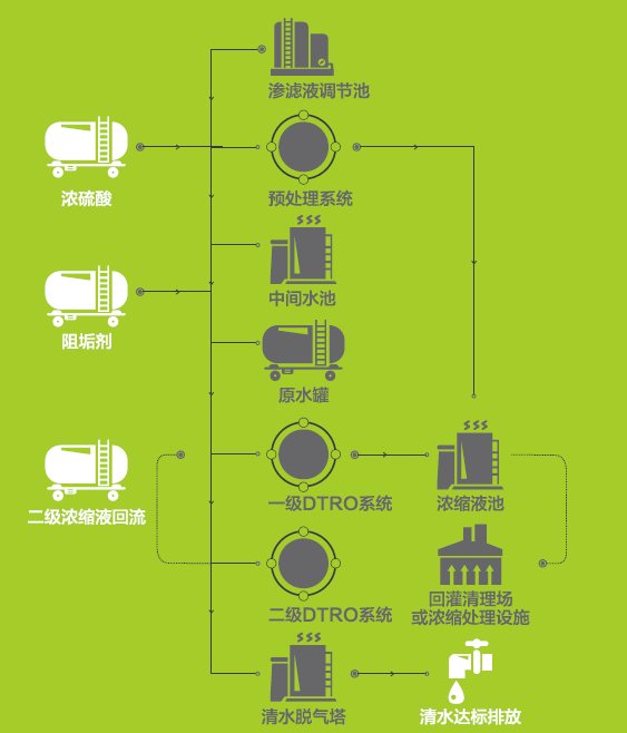 顺利获得提升泵将渗滤液输送至两级DTRO渗滤液处理设备处理,产水达到排放标准直接外排,浓缩液回灌至填埋场。